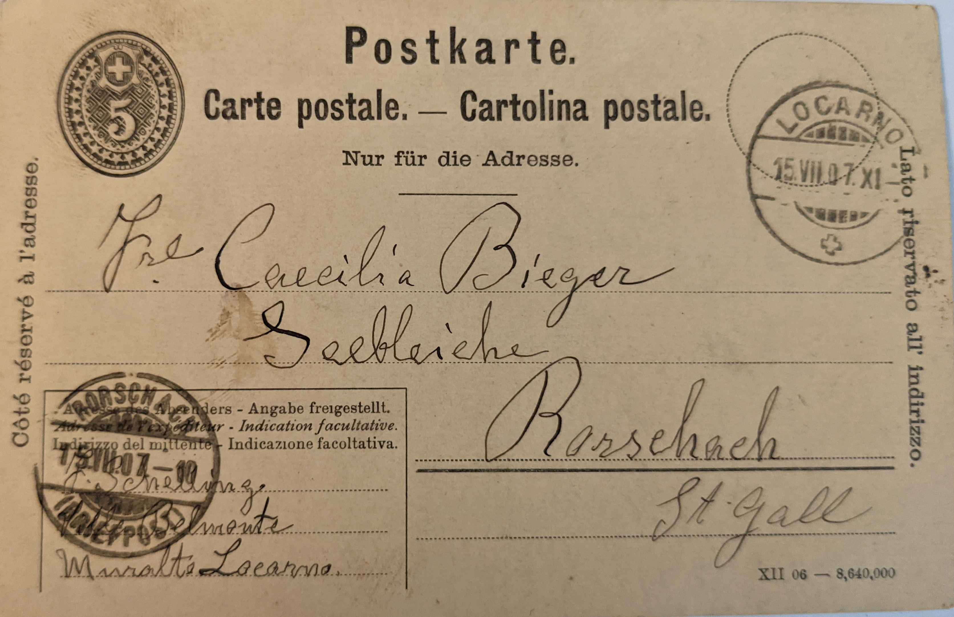 F. Schelling an Caecilia Bieger, 15.07.1907, Locarno