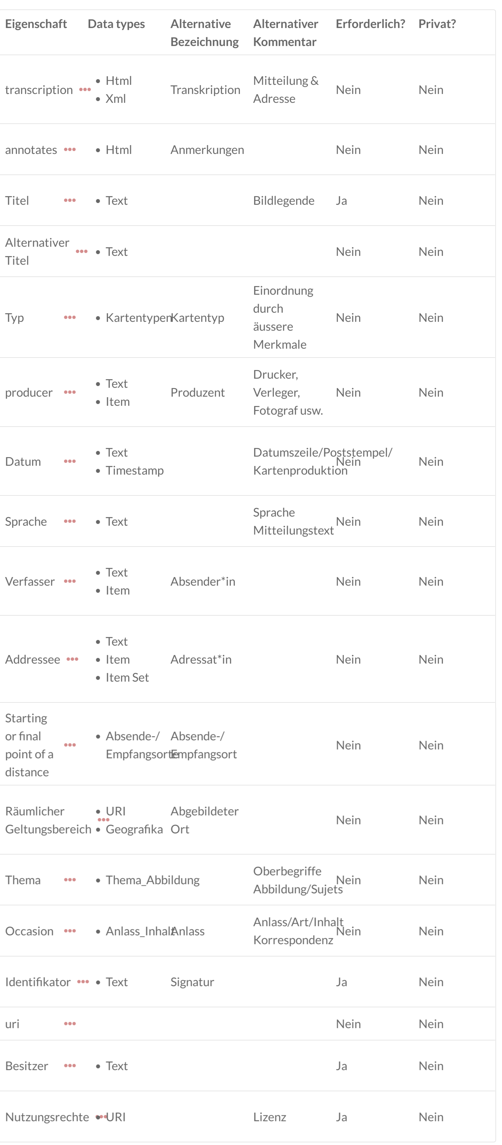 Jede Postkarte wird mit einem Standardset an Beschreibungsfeldern resp. mithilfe der eigens erstellten Ressourcenvorlage für Postkartenobjekte erfasst. Die Ressourcenvorlage enthält Felder, die für jeden Postkarteneintrag zwingend notwendig sind, sowie optionale Felder, die nach Möglichkeit ausgefüllt werden sollten. Zusätzlich dazu könnten bei jedem Postkartenobjekt auch noch andere Felder (aus den entsprechenden Vokabularen) hinzugefügt werden. Da über manche Postkarten bedeutend weniger Aussagen gemacht werden können und sich bei unbeschriebenen Karten zahlreiche Metadatenfelder erübrigen (Transkription, Alternativer Titel, Sprache, Absender*in, Adressat*in, Anlass, Absende-/Empfangsort), sind für das Erfassen einer Postkarte nur wenige Felder zwingend erforderlich (Titel, Signatur, Besitzer, Nutzungsrechte). Dies wurde bewusst so eingerichtet, damit jedes Objekt zumindest die wichtigsten Angaben enthält und diese bei der Eingabe nicht vergessen gehen können, da das Abspeichern einer neuen Ressource beim Fehlen erforderlicher Werte blockiert wird.